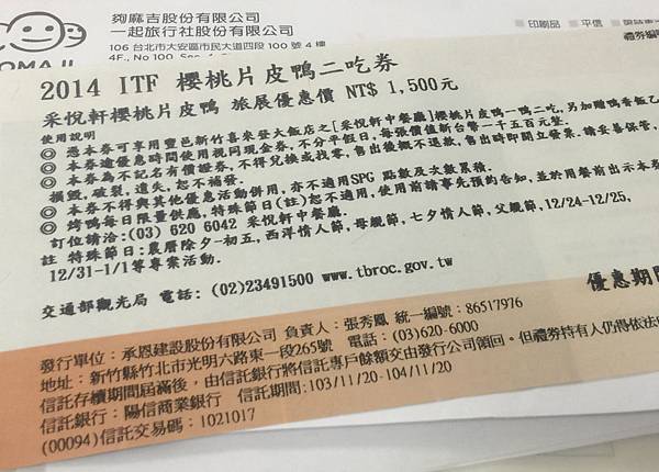 因為蜜月團好友夫妻都是烤鴨愛好者,一看到GOMAJI有賣喜來登烤鴨卷原價1980,麻吉價1500!立馬約好時間決定嚐鮮!下訂後發現其實這鴨卷應該是推出一陣子但不紅~想說找些評價,怕踩到地雷!但完全找不到櫻桃鴨評價~所以告訴了同行友人期望不要太高!訂了平日晚上的位置,餐廳其實已經有5.6組客人,服務員也蠻多的,氣氛也好!有加分~因餐卷部分已含一鴨二吃,跟鴨香飯!後來服務員建議可點到三吃,三吃蠻多選擇:有鴨鬆,鴨湯,炒鴨架,鴨粥(第三吃只需加200)~後來選定了片皮鴨,鴨湯跟鴨鬆(好吃的留在後面好好介紹)港點部分選了,叉燒酥(120元)就一般般~ 蔥花油條腸(130元),油條很脆沾到汁也還夠脆,只可惜不夠熱!香芋蓮藕糕(120元),表皮夠酥,吃的到一顆顆的碎蓮藕,但芋香味我覺得不夠重! 其他大菜真的不敢點,因為三吃的份量已經足夠了,只加點個蝦醬娃娃菜(260元) 以上的菜都還算滿意,但沒到驚豔的境界! 重點來了~我們期待的烤鴨,選用3.5kg的櫻桃鴨!油亮的外皮,烤的顏色非常均勻!很棒的深焦糖色!光看就很滿意~ 餅皮部分有用蒸籠保溫 天呀!每人一盤連餅皮都分配好!真的是色香味具全,一口咬下去可以感覺鴨皮的脆香,然後肉汁滿口~~ 側面看的出肉跟皮的比例真的是剛剛好!沒有多餘的油,吃完了五份,真的還意猶味盡,而且也完全沒有鴨腥味!